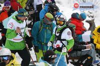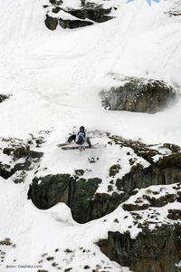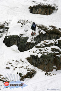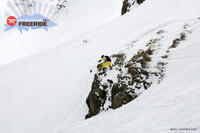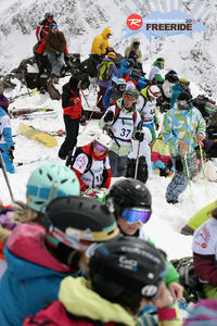 Первый среди лыжников на данный момент Идрис Узденов. Никакого сюрприза здесь нет молодой эльбрусский райдер с того момента, как начал выступать в соревнованиях, еще никому не уступил первого места. Его проезд был традиционно сильным. Начав свое выступление с большого прыжка с приземлением прямо на плоскач, он сделал большой фронт флип с дежурного дропа посреди кулуара (с него прыгало подавляющее большинство участников, включая девчонок) и поехал в скальный участок, показав там хорошую технику владения лыжами и закончил проезд еще одним прыжком с большой скалы.