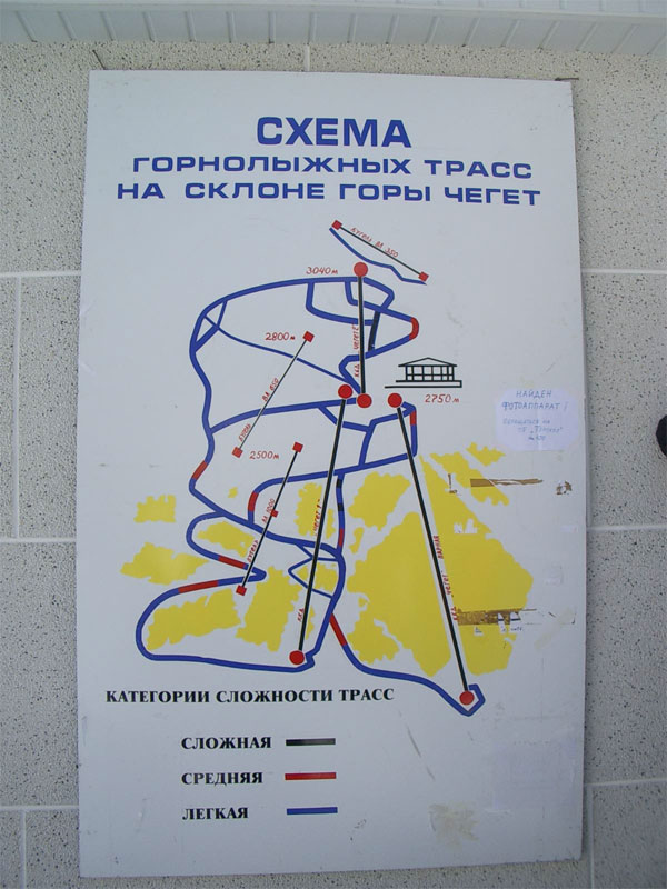 долго смеялись над черной трассой, если поискать ее можно найти. Это спад на втором чегете, который проходится в две дуги максимум, ну один раз удалось 2.5 сделать. И если присмотретЬся, то можно увидеть, что все синии трассы пересекают красные ленточки, а значит и вся трасса по определению - красная. Просто надо догадаться и незачем дефицитную красную краску расходовать. | ||