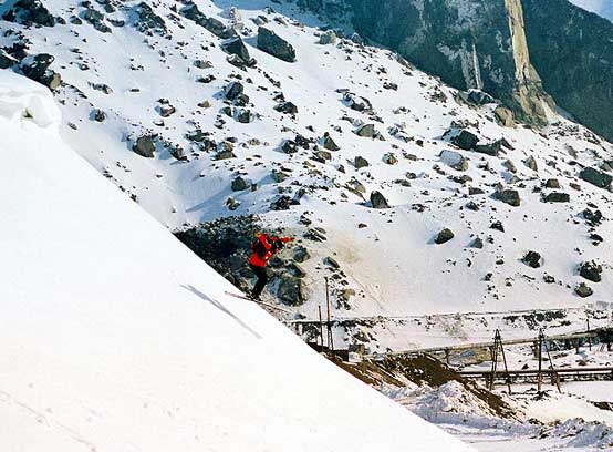 Пожалуй термин "сухой" недостаточен для определения снега, ложащегося конусом. Кристаллы очень мелкие, образуются путем выдувания из плотного, слежавшегося снега, катятся и попадают в кулуары, если вход узкий, затем расширение, то образуется конус. Начинается процесс снизу, когда вершина конуса достигает входа - получается крутизна 54 градуса, не больше. Мои паудеры+ 180Х134-114-124, всплывают и на таком:-))) | ||